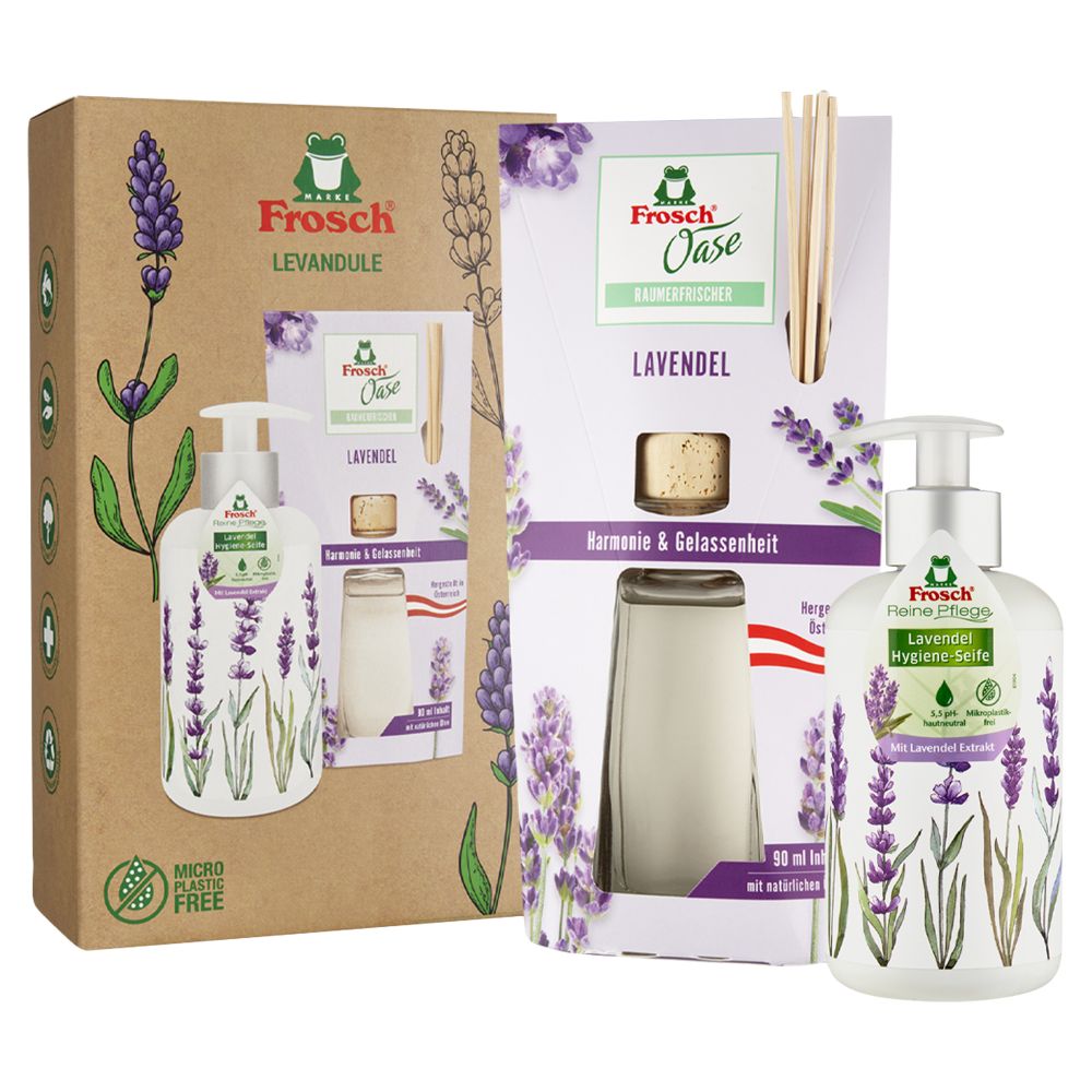 obsahuje Frosch Oase bytový parfém inspirovaný naukou o aromaterapii. Přináší pečlivě vybranou vůni levandule s čistě přírodním složení na bázi esenciálních olejů. Bytové parfémy zajistí vašemu domovu příjemnou atmosféru na 6 – 8 týdnů. A dále Frosch mýdlo Levandule jemně čistící, které zároveň pečuje o pokožku vašich rukou. Výtažky z levandule zanechají vaše ruce jemné a přírodní složení s neutrálním pH 5,5 zajistí hydrataci. Neobsahuje parabeny ani barviva a je dermatologicky testované. Cena dárkové sady je 299 Kč.