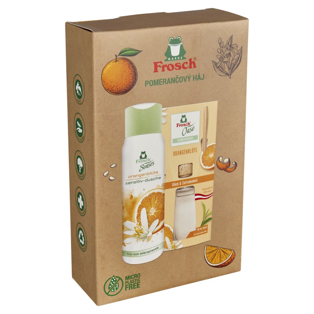 obsahuje sprchový gel s vůní květu pomeranče a bytový parfém. Provoňte svou koupelnu jemnou pomerančovou vůní, která ulevuje při neklidu a úzkosti a nabíjí pozitivní energií. Vychutnejte si sprchování s jemným gelem, který hýčká vaši pokožku. Frosch Oase je inspirována naukou o aromaterapii a přináší pečlivě vybrané vůně s čistě přírodním složení na bázi esenciálních olejů. Bytové parfémy zajistí vašemu domovu příjemnou atmosféru na 6 – 8 týdnů. Cena výrobku je 299 Kč.