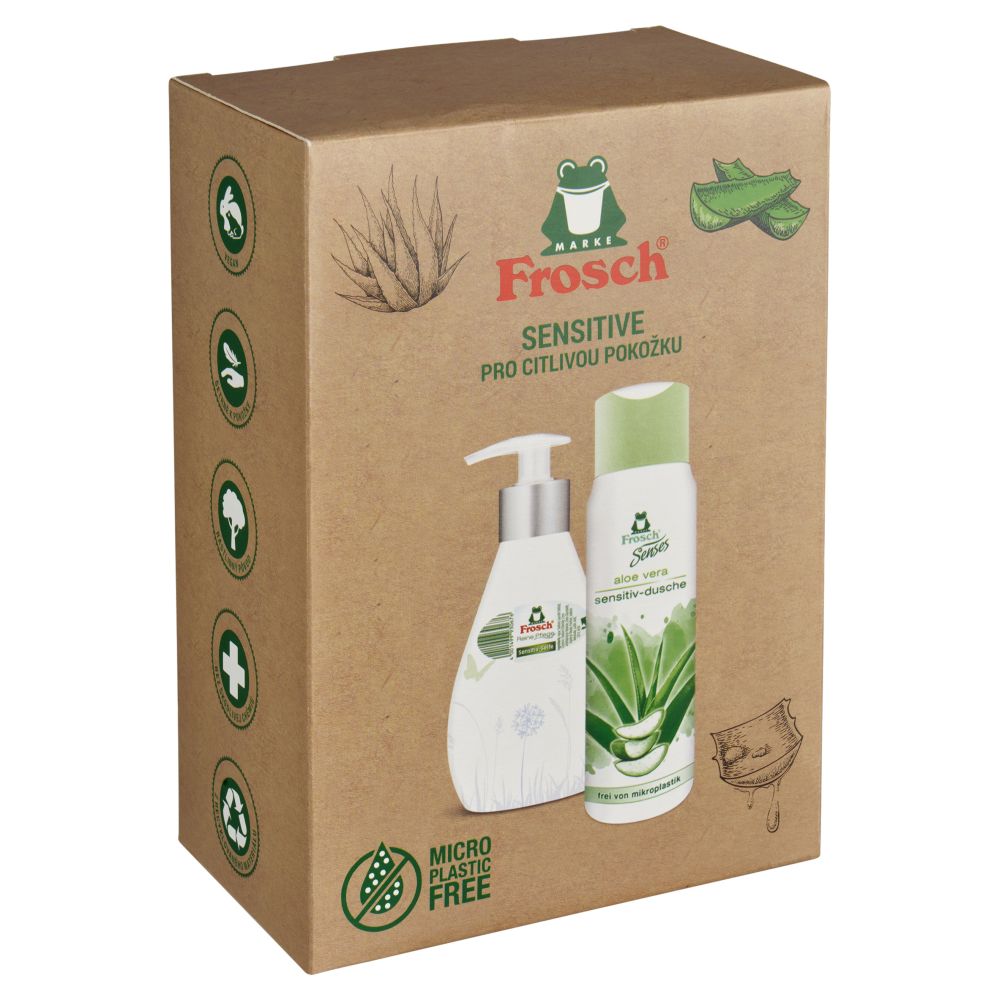obsahuje sprchový gel Frosch Senses Aloe vera a dávkovač tekutého mýdla s jemnou vůní. Je vhodná i pro citlivou pokožku. Složení s panthenolem pečuje a hydratuje pokožku, zatímco jemná vůně působí povzbudivě na vaše smysly. Šetrné složení kosmetiky Frosch na bázi přírodních látek je pH 5,5 neutrální a panthenol obsažený ve sprchovém gelu pokožku hydratuje. Receptury neobsahují škodlivé chemické látky jako parabeny, ropné deriváty, mikroplasty nebo EDTA. Cena dárkové sady je 149 Kč.
