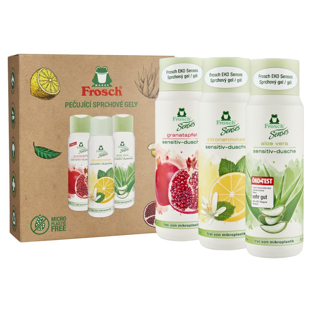 Provoňte svůj domov uklidňující levandulovou vůní pomáhající při stresu, nespavosti, a přispívající k celkové harmonii. Nebo jemnou vůní aloe vera obsaženou ve sprchovém gelu Frosch Senses Aloe vera a mýdle vhodném pro citlivou pokožku. Či jemnou pomerančovou vůní ulevující při neklidu a úzkosti a nabíjející pozitivní energií. Vychutnejte si sprchování s jemným gelem, který hýčká vaši pokožku. Nechte se osvěžit svěží vůní citronu a máty a užijte si sprchování s péčí přírodního sprchového gelu, který je šetrný k vaší pokožce. Získáte krásně jemnou a hebkou pokožku díky péči během každé sprchy. Řada sprchových gelů Frosch Senses má šetrnou recepturu na bázi přírodních látek s neutrálním pH 5,5. Jejich složení je obohaceno o panthenol pro hydrataci pokožky. Svým dětem a jejich citlivé pokožce dopřejte pak výtažek z pšeničného proteinu obsažený v šamponu pro děti usnadňující rozčesávání dětských vlásků. Navíc jim dodá lesk. A pokud si nemůžete z vůní vybrat a chcete jich vyzkoušet hned několik najednou, vyberte sadu Frosch obsahující tři vůně – granátové jablko, citron máta a aloe vera. Volba vhodného dárku nemůže být snadnější. Značka Frosch nově přichází s eko dárkovým balením pro letošní Vánoce, a to v podobě Frosch Dárková sada Levandule, Frosch Dárková sada Sensitive, Frosch Dárková sada pro děti, Frosch Dárková sada Citron a máta, Frosch Dárková sada Sprchové gely a Frosch Dárková sada Pomerančový háj.