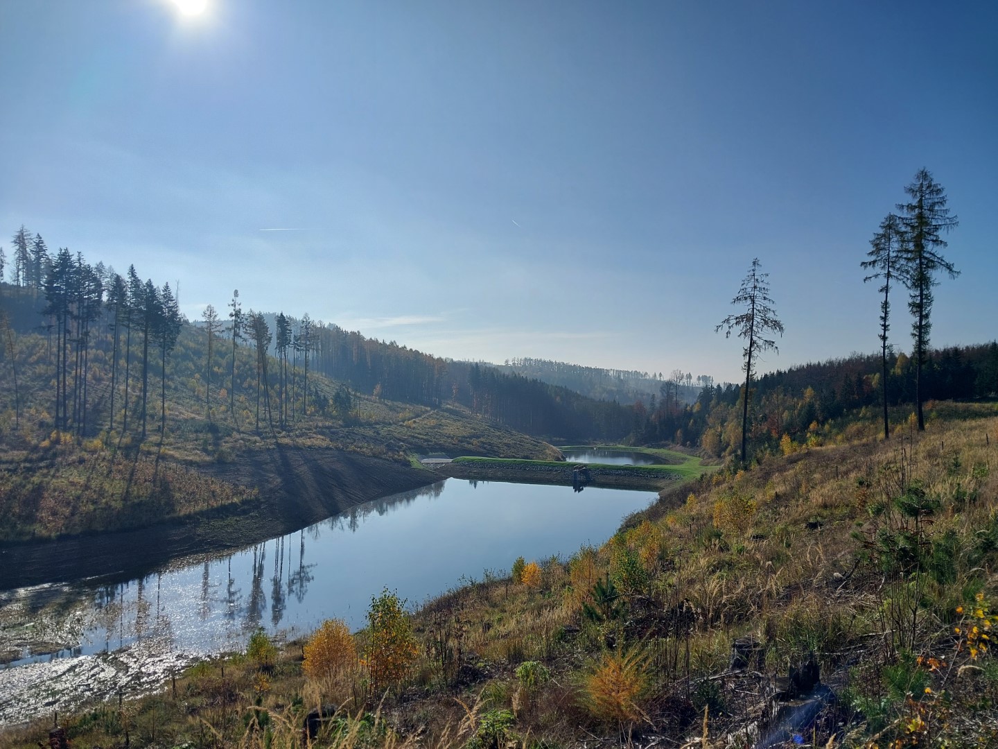 54 tisíc metrů krychlových vody a dalších 470 metrů krychlových v deseti tůních. Hráze jsou