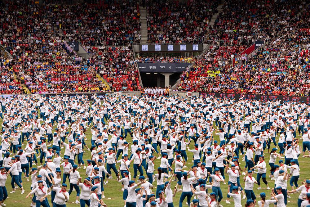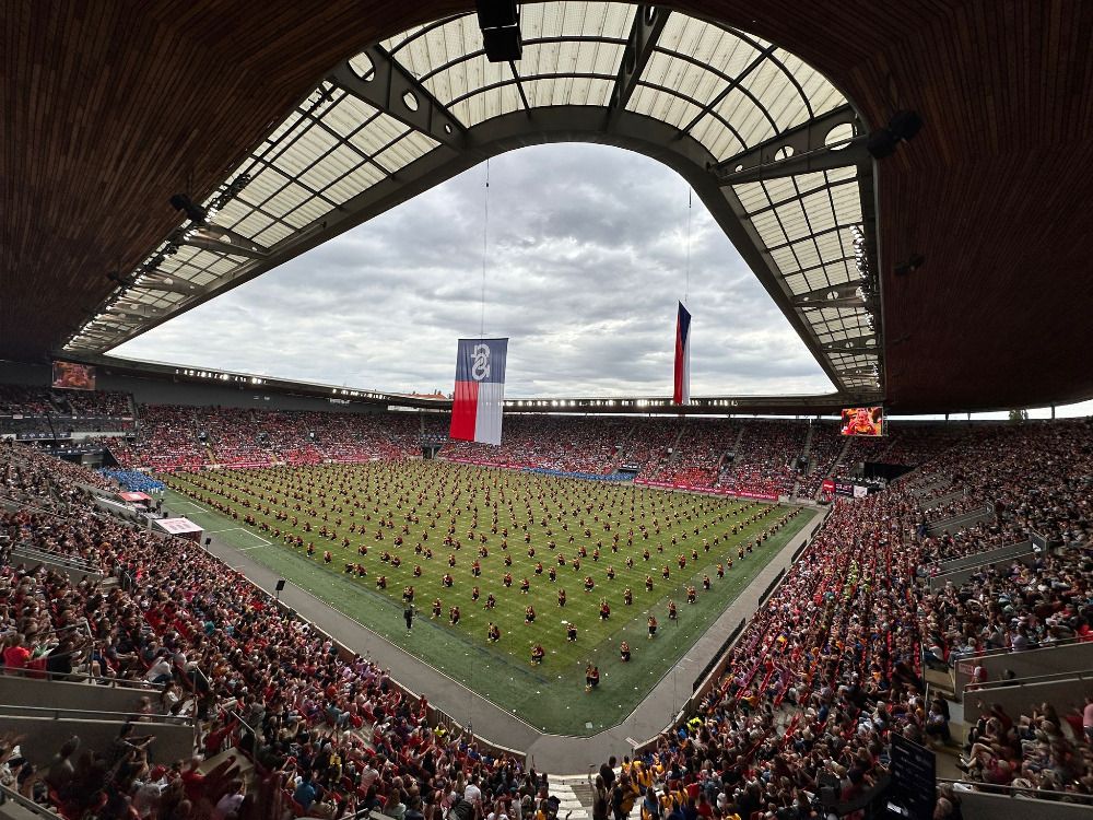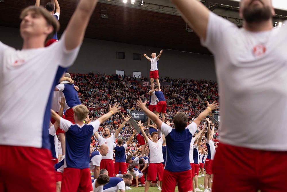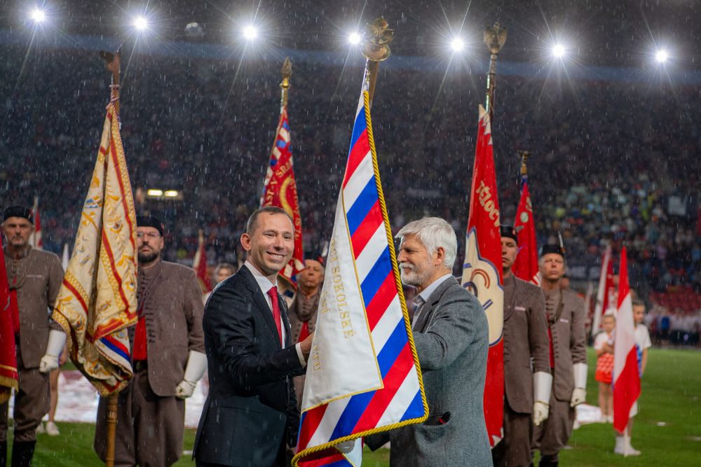 Hromadnými skladbami vyvrcholil ve čtvrtek a pátek XVII. všesokolský slet. Do první části hromadných skladeb se ve čtvrtek zapojilo se téměř 11 300 cvičenců z 13 zemí a z čestné lóže je sledoval i prezident Petr Pavel. Ten starostovi České obce sokolské Martinu Chlumskému předal čestný prapor. Večer zpestřilo vystoupení zpěváků Lucie Bílé a Jiřího Korna.