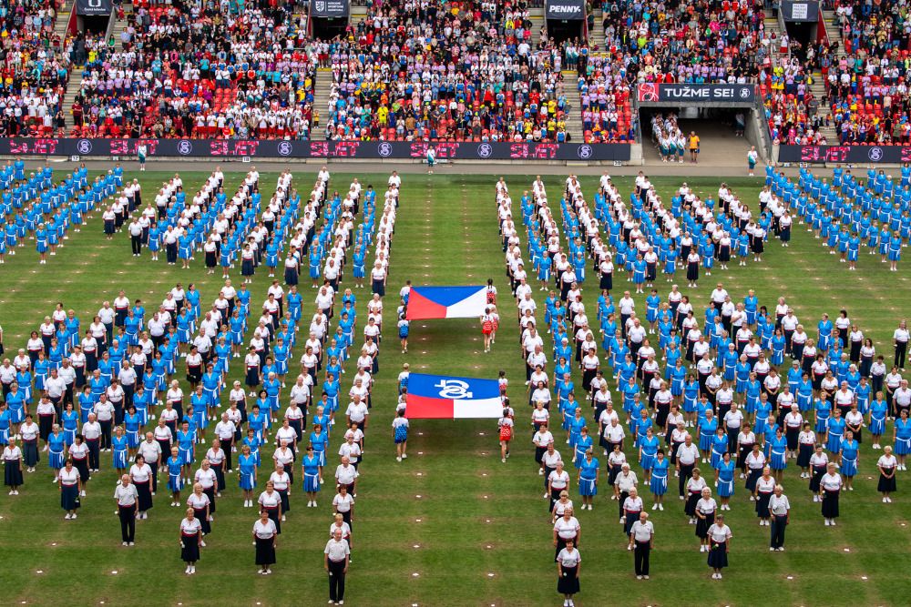 Hromadné skladby nemají ve světě obdoby. Vyvrcholilo několik roků příprav pro organizátory a mnoha měsíců nácviku pro tisíce cvičenců z jednot po celé republice i ze zahraničí. Ve čtvrtek hustě pršelo přes půlku programu. Cvičenci však vystoupili s velkým entuziasmem navzdory dešti. Starosta ČOS Martin Chlumský řekl na úvod: „Už 162 let vedeme Čechy k pohybu a společné aktivitě a jsem nesmírně rád, že si můžeme při tak úžasné atmosféře vychutnat naši pospolitost. Slet totiž spojuje. Spojuje generace, sport s uměním, regiony, republiku se zahraničím. Dnes tady můžeme být jako jedna velká sokolská rodina, která vyznává stejné hodnoty.“ Uvítal, že po 18 letech navštívil slet prezident České republiky. „Vnímám to jako ocenění úsilí účastníků sletu, všech 160 000 členů České obce sokolské a činnosti našeho spolku, „dodal Chlumský. „Sokol nejenže přitahuje mladou generaci ke sportu a zlepšuje odolnost a zdraví, ale také přispívá ke skutečnému vlastenectví, solidaritě a respektu k ostatním. A učí nás, že pro úspěch je nutné mnohé vykonat,“ řekl prezident Pavel. Připomněl účast Sokolů v historických okamžicích historie za naši národní svobodu – účast v Legiích i v odboji za II. sv. války. Prezident také ocenil organizaci letošního sletu: „Uspořádat takovou akci a udržet po celou dobu skvělou atmosféru, za to vám patří velký obdiv a dík.“ Pak s ohledem na počasí parafrázoval výrok krále Jana Lucemburského: „Toho bohdá nebude, aby český sokol z mokrého trávníku utíkal“