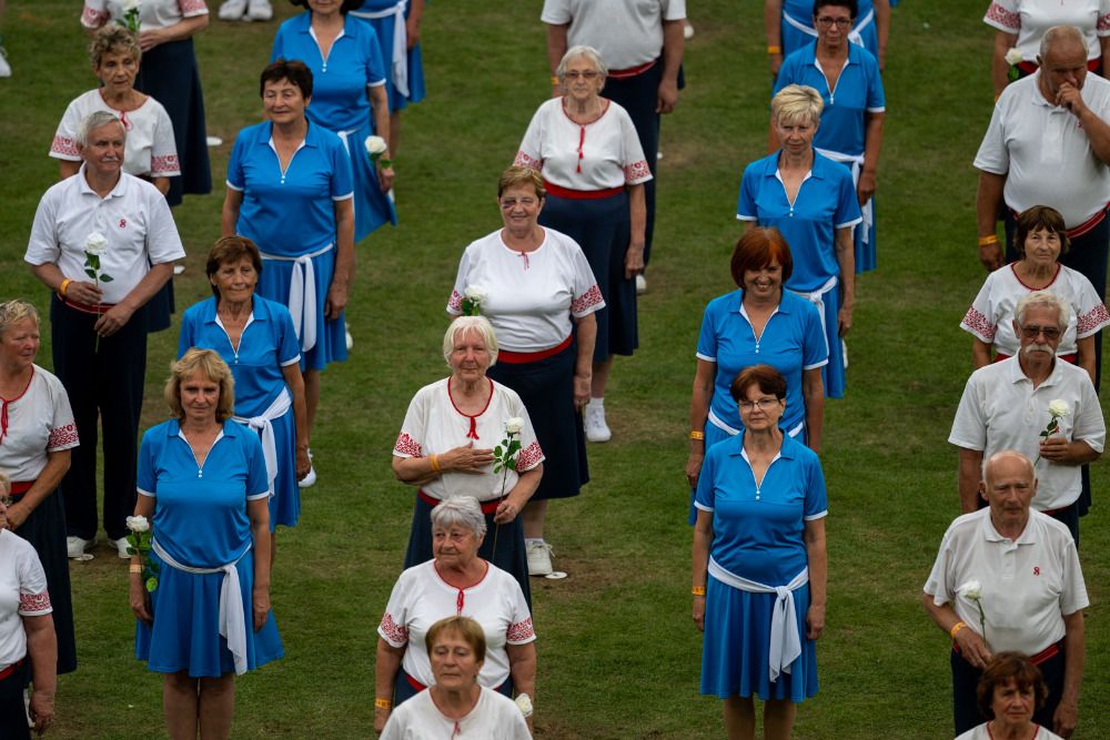 Sokolskou drobotinu na ploše vystřídali senioři a seniorky ve slušivých modrobílých oblecích. Skvěle secvičené obrazce ve skladbě Jdi za štěstím na písně Karla Gotta byly důstojným zakončením celého sletu. Celá Fortuna arena byla na nohou, když na plochu vběhly děti a své babičky a dědečky – starou gardu obdarovaly květinou. Další důkaz, jak všesokolský slet dokáže spojovat. V rámci programu byl XVII. všesokolský slet slavnostně zakončen.