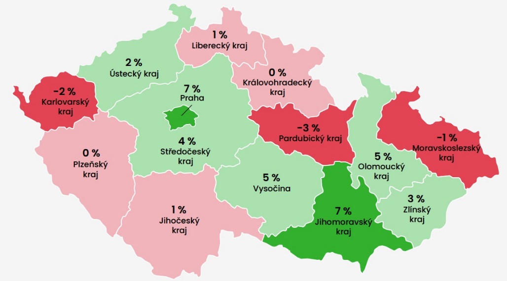 Pohled na mapu republiky potvrzuje, že hlavní město a Brno se stále výrazněji vzdalují celorepublikovým průměrům. Praha i Jihomoravský kraj totiž za loňský rok shodně dosáhly 7procentního nárůstu tržeb, tedy více než dvojnásobku celorepublikového průměru. Jejich úspěchy bohužel na druhé straně vyvažovaly kraje, které skončily v mínusových hodnotách.