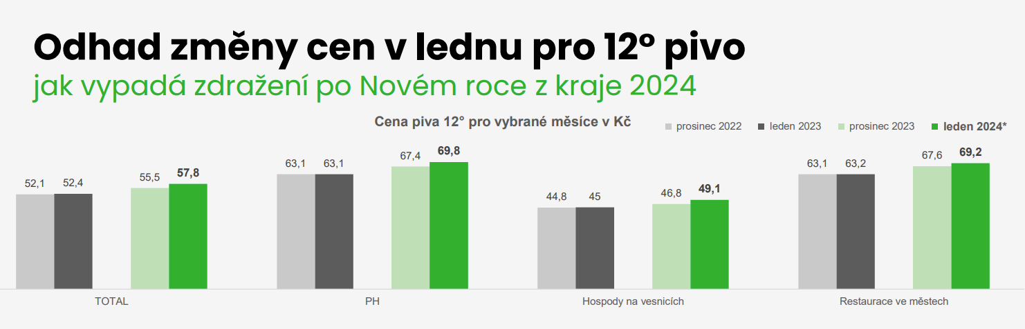 V Praze milovníci zlatého moku nyní zaplatí za jeden 12° půllitr zhruba o 12 korun víc, než činí celorepublikový průměr. Naopak ve vesnické hospodě je cena oproti průměru skoro o 9 korun nižší. Všude ale ceny poskočily oproti prosinci víc než o 2 koruny na jedno pivo.