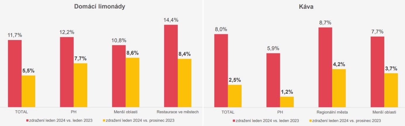 Meziměsíční nárůst cen mezi prosincem a první polovinou ledna zaznamenala společnost Dotykačka i u dalších nápojů, například kávy nebo domácích limonád. Prozatím nejsou nárůsty cen nijak dramatické – u kávy je to v průměru 2,5 procent a u limonád 5,5 procent. Dlouhodobé sledování trhu však naznačuje, že velká část podniků upravuje ceny až v únoru. Je tedy pravděpodobné, že rozdíly v cenách nápojů v nadcházejícím období ještě porostou.