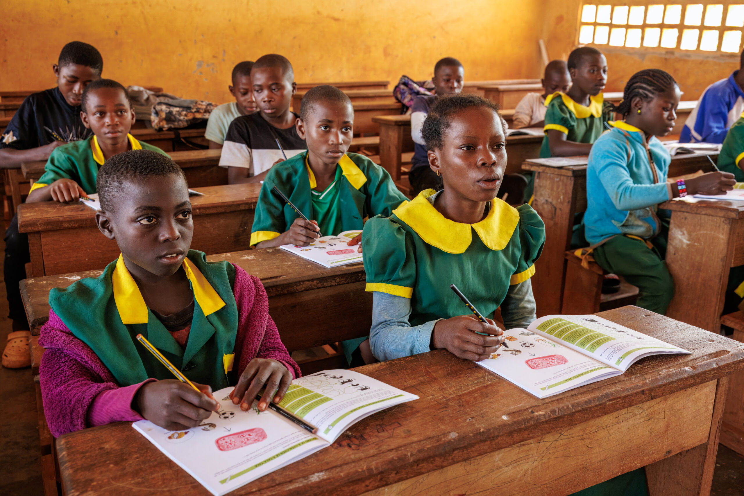 Foto 2: Ve škole v kamerunském Somalomo obdržely novou vzdělávací brožuru Zoo Praha první děti. Vyučující ji ihned zapojil do výuky, zatímco zástupci pražské zoo představili metodiku práce s jednotlivými úkoly. Foto Miroslav Bobek, Zoo Praha