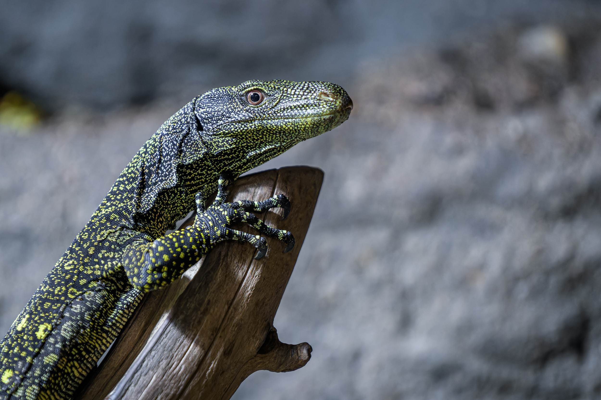 Foto 1: Varani Salvadoriovi budí respekt mimo jiné mohutnou hlavou se silnými čelistmi, osazenými dlouhými zuby. Jejich štíhlá těla zdobí výrazný černožlutý vzor. Foto Petr Hamerník, Zoo Praha