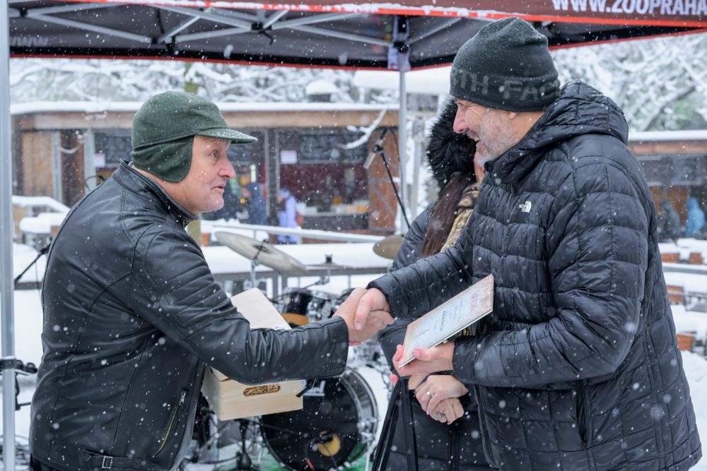 Foto 3: Prof. Zdeněk Fránek přebral cenu Divoký Richard od ředitele Zoo Praha Miroslava Bobka za své nezištné architektonické návrhy vzdělávacích center v Kamerunu a Kongu. Foto Petr Hamerník, Zoo Praha