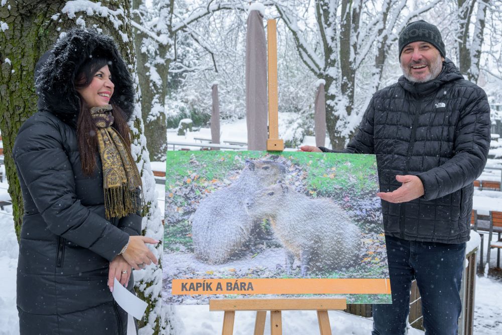 Foto 4: Kapík a Bára – taková jména dostal mladý pár kapybar, který zoo představila veřejnosti v polovině listopadu. Na snímku ředitel Zoo Praha Miroslav Bobek a operní pěvkyně Andrea Kalivodová. Foto Petr Hamerník, Zoo Praha
