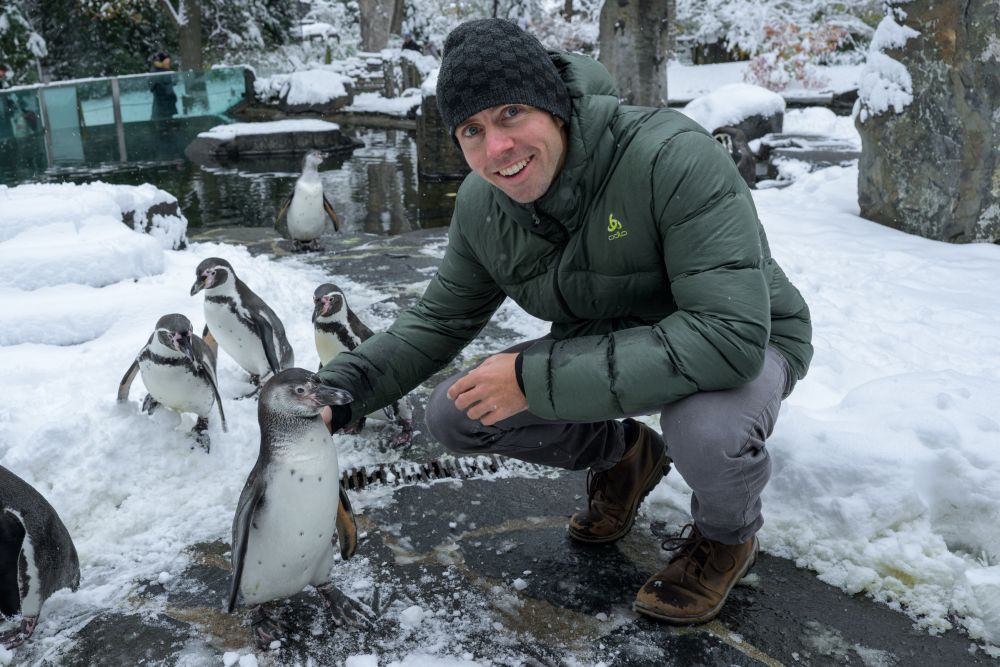 Foto 5: Kajakář Ondřej Tunka s tučňákem Buřtíkem. Návštěvníci mládě v hejnu dobře poznají podle popelavého zbarvení, přičemž typický šat dospělců nabude až v létě. Foto Petr Hamerník, Zoo Praha