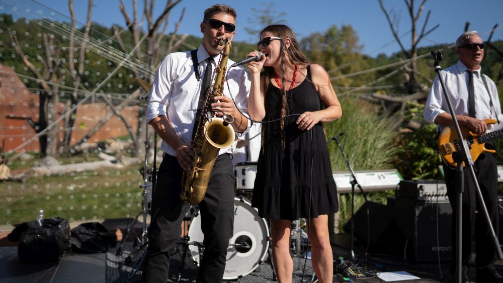 Foto 2: Návštěvníky čekala na Rezervaci Dja i kapela Laura a její tygři. Její vystoupení se zájmem sledovaly gorily i guerézy. Foto Tereza Šolcová, Zoo Praha