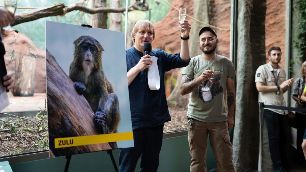 Foto 3: Jedním z bodů slavnostního programu bylo i odhalení jména prvního mláděte nového pavilonu goril, Rezervace Dja. Půlročního kočkodana Brazzova „pokřtil“ herec a bavič Lukáš Pavlásek. Na snímku s vrchním chovatelem primátů Martinem Vojáčkem. Foto Tereza Šolcová, Zoo Praha