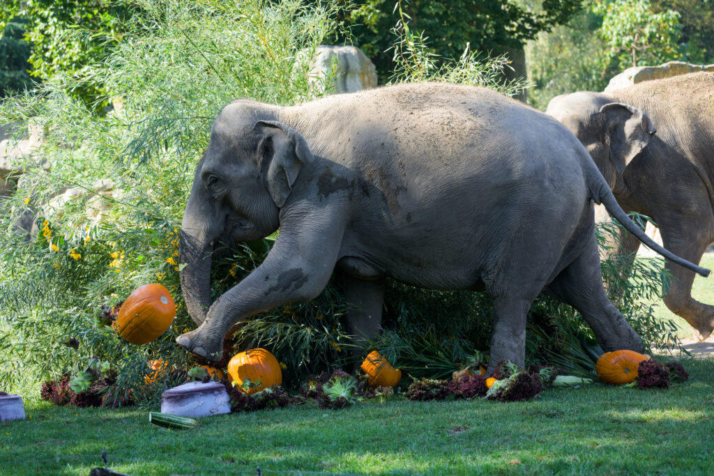 Foto 4: Sloni byli jedněmi z jubilantů a obdrželi proto dárek v podobě do srílanských barev zahaleného potravního enrichmentu. Nejen, že jejich chov v Zoo Praha dosáhl přesně 90 let, ale současně uplynulo 10 let od otevření velkolepého Údolí slonů, kde nalezli sloni optimální podmínky pro odchov mláďat. Foto Petr Hamerník, Zoo Praha