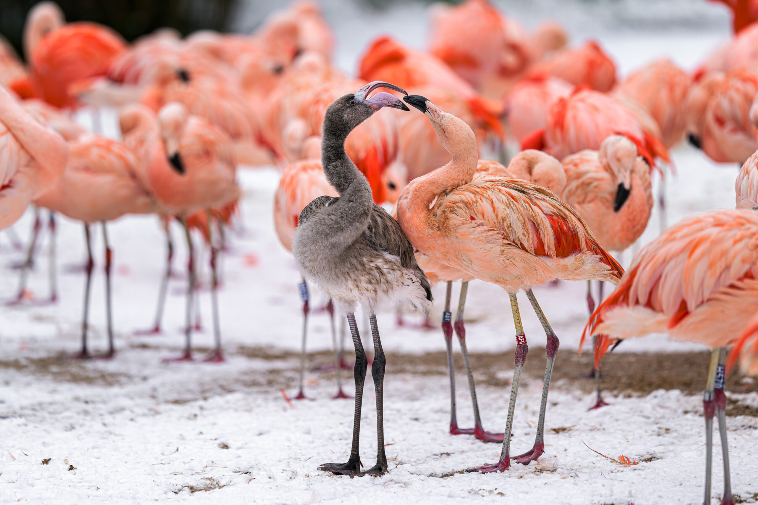 Foto 4: Plameňáci dávají přednost pobytu venku i ve sněhu. Načechrané peří je ohřívá a nohy je nezebou díky pozoruhodně uspořádanému krevnímu oběhu. Na snímku je letošní mládě plameňáka chilského. Foto Petr Hamerník, Zoo Praha