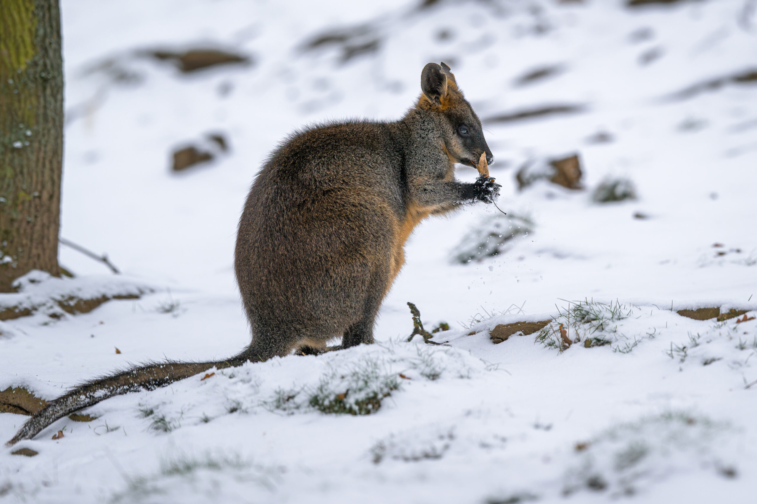 Foto 6: Pohled na klokany ve sněhu může Evropanům připadat zvláštní, ale řada druhů těchto vačnatců je na něj zvyklá i ve své domovině. Na snímku je klokan bažinný původem z jihovýchodní Austrálie. Foto Petr Hamerník, Zoo Praha