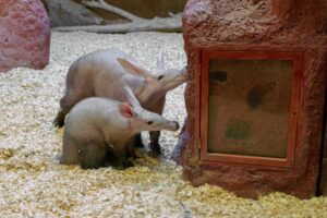 Foto 2: Malá samička hrabáče kapského byla slavnostně pokřtěna jako „Farisa“, tedy „ta, co přináší štěstí“. Na snímku s matkou Kvídou, jejíž je Farisa už čtvrté úspěšně odchované mládě. Foto Petr Hamerník, Zoo Praha