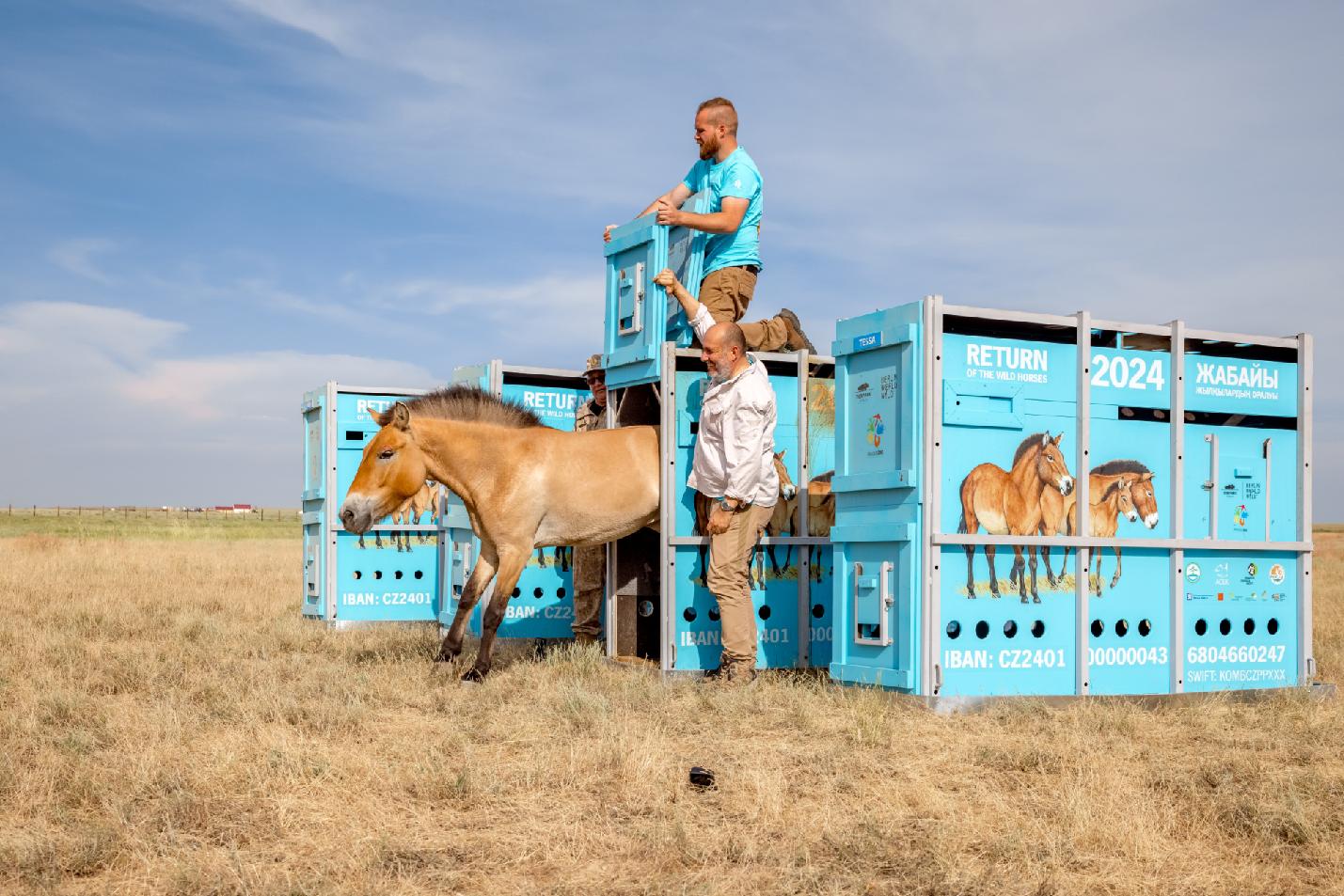 Foto 3: Vypouštění koní Převalského ve Zlaté stepi ve středním Kazachstánu letos na začátku června. Právě za podporu projektu Návrat divokých koní dnes Zoo Praha udělila ocenění Velký Richard a Divoký Richard. Foto Miroslav Bobek, Zoo Praha