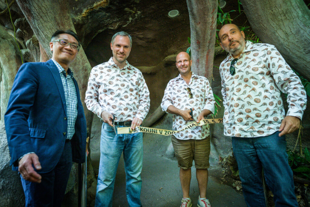 Foto 3: Slavnostní přestřižení pásky před noční expozicí Indonéské džungle. Zleva: Vedoucí Tchajpejské hospodářské a kulturní kanceláře v ČR Liang-Ruey Ke, primátor hl. m. Prahy Zdeněk Hřib, náměstek primátora Petr Hlubuček, ředitel Zoo Praha Miroslav Bobek. Foto Petr Hamerník, Zoo Praha