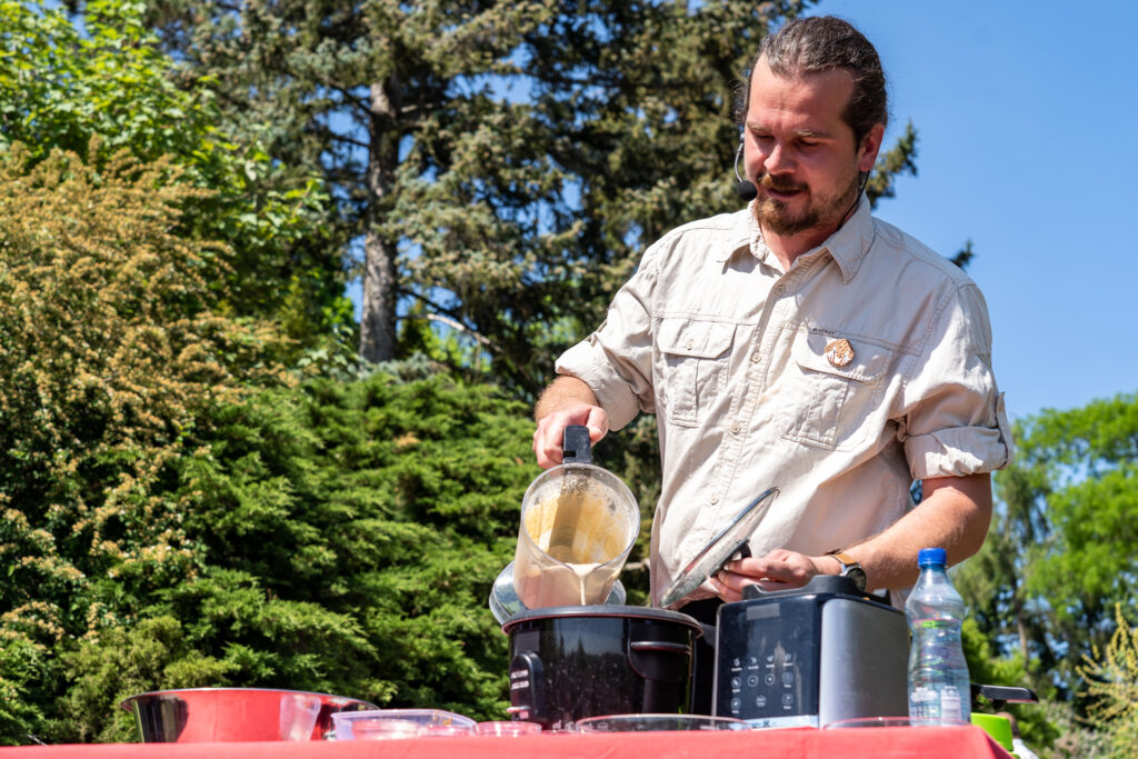Foto 4: Součástí akce byla i ukázka přípravy krmné kaše pro luskouny. Tu přichystal jejich chovatel David Vala (na snímku) spolu s šéfkuchaři Romanem Paulusem a Markem Fichtnerem přímo před návštěvníky zoo. Foto Oliver Le Que, Zoo Praha