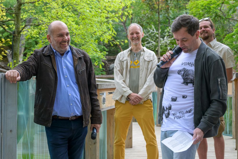 Zleva: ředitel Zoo Praha Miroslav Bobek, kurátor savců Pavel Brandl, herec Ondřej Sokol a chovatel vombatů David Vala. Foto Petr Hamerník, Zoo Praha