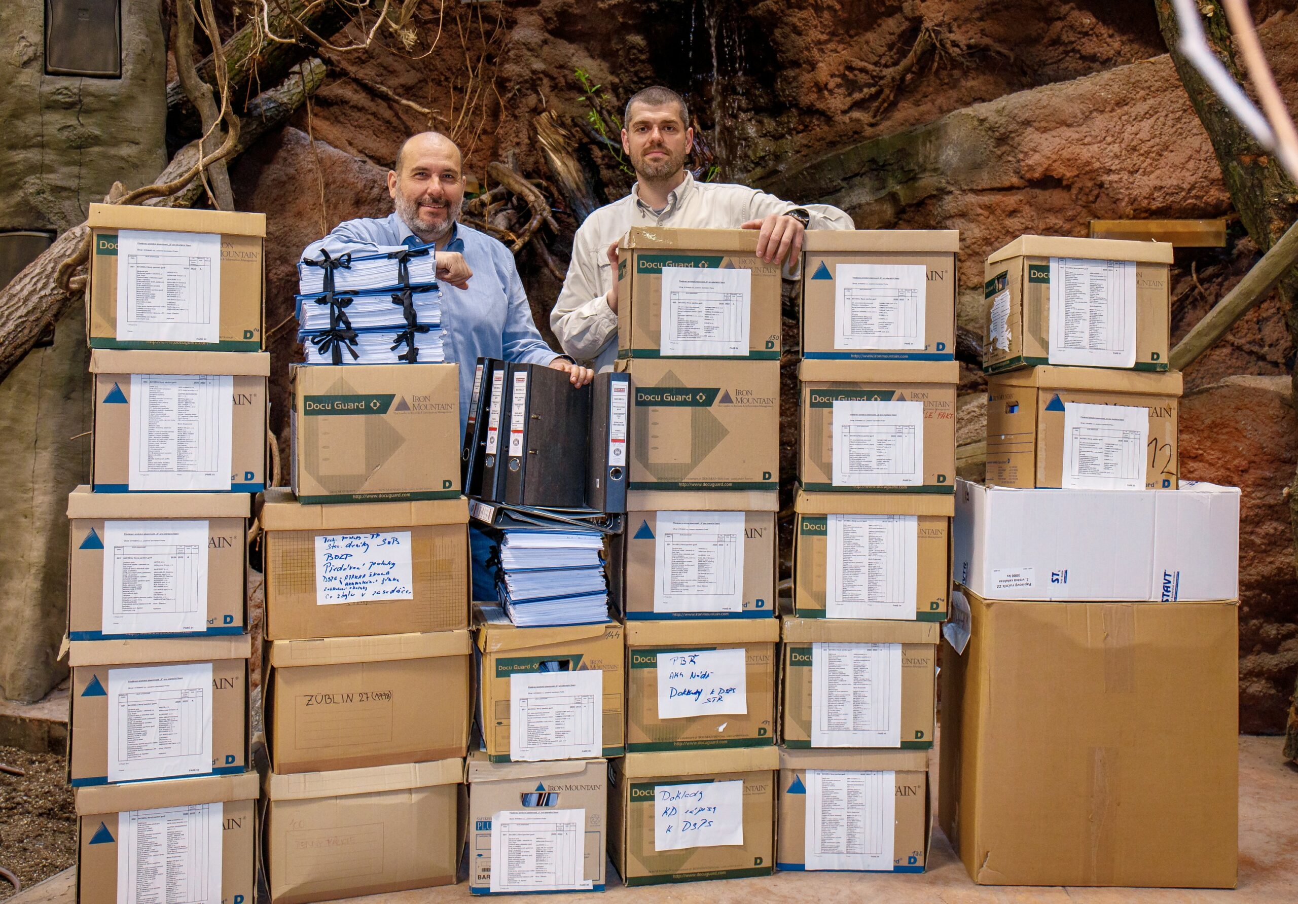 Foto 1: Ředitel Zoo Praha Miroslav Bobek a vedoucí stavebního oddělení Lukáš Divoký před krabicemi veškeré dokumentace nutné k udělení kolaudačního souhlasu. Foto archiv Zoo Praha
