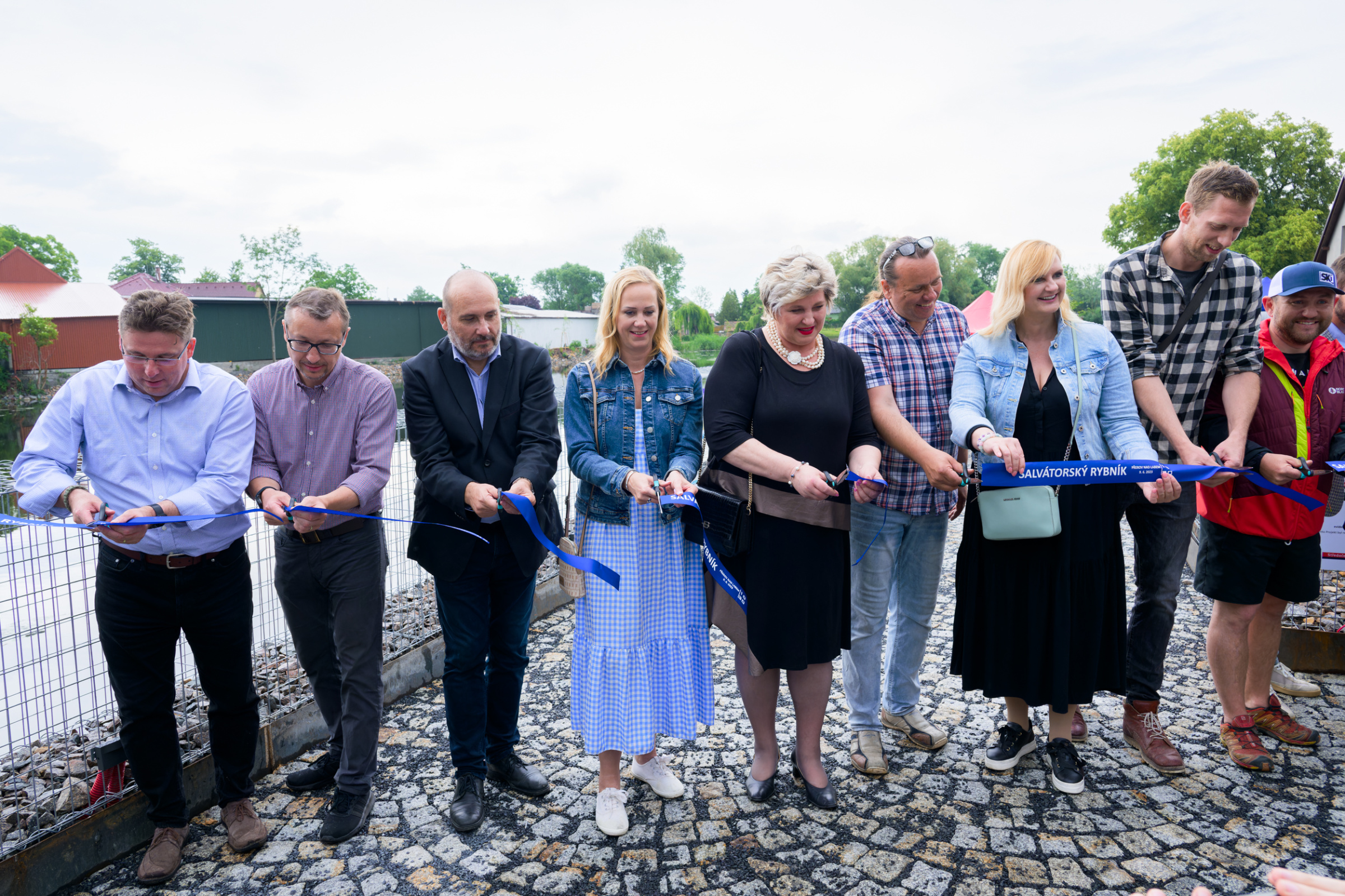 Foto 3: Přestřižení pásky u nově zrevitalizovaného Salvátorského rybníka v Přerově nad Labem předcházelo samotnému vypuštění karasů obecných. Vedle celé řady obecních spolupracovníků se ho zúčastnil ředitel Zoo Praha Miroslav Bobek, dále vedle něj zprava na snímku náměstkyně primátora hl. m. Prahy pro oblast životního prostředí Jana Komrsková, první místopředsedkyně Poslanecké sněmovny Parlamentu ČR Věra Kovářová, starosta obce Jiří Beneš a hejtmanka Středočeského kraje Petra Pecková. Foto Petr Hamerník, Zoo Praha