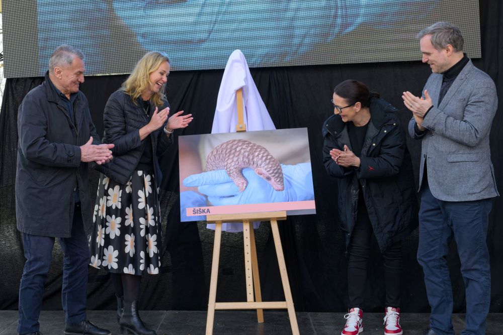 Foto 2: První mládě luskouna v Evropě dostalo v sobotu 25. března své jméno – v hlasování veřejnosti na Portálu Pražana zvítězil návrh Šiška, přičemž tak byla malá samička během zahájení sezóny slavnostně pokřtěna. Zleva: Primátor hl. m. Prahy Bohuslav Svoboda, jeho náměstkyně pro životní prostředí a klimatický plán Jana Komrsková, náměstkyně primátora pro oblast sociálních věcí, bydlení a zdravotnictví Alexandra Udženija, náměstek primátora pro dopravu Zdeněk Hřib. Foto Petr Hamerník, Zoo Praha