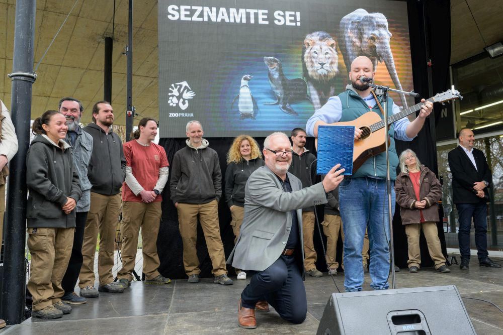Foto 4: Za účasti patronů jednotlivých zvířecích osobností nové kampaně Seznamte se! zahrál písničkář Pokáč svůj Zoo Song v živé premiéře. O živoucí stojan na text se pohotově postaral moderátor Jan Kovařík. Foto Petr Hamerník, Zoo Praha