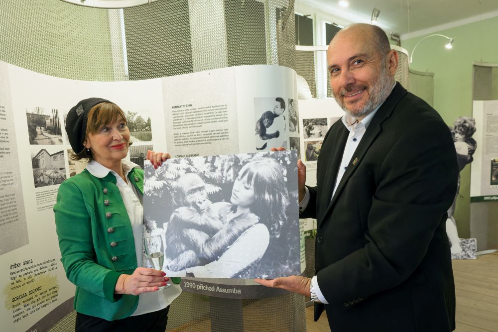 Foto 5: Herečka a zpěvačka Petra Černocká zahájila spolu s ředitelem Zoo Praha Miroslavem Bobkem výstavu 60 let chovu goril a připojila své osobní vzpomínky na natáčení s nimi. Fotografickou expozici naleznou lidé v galerii Gočárovy domy až do půlky června. Foto Petr Hamerník, Zoo Praha