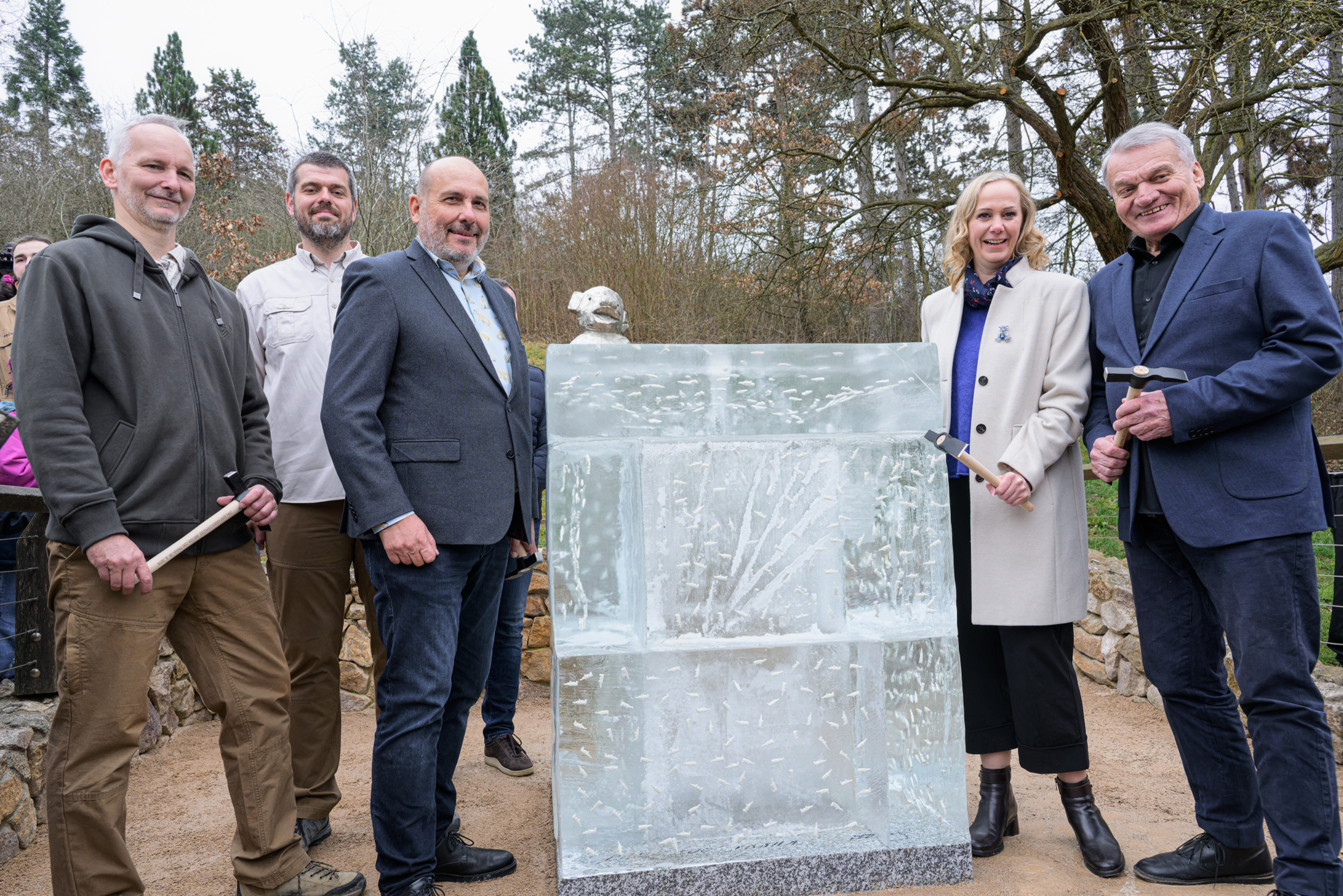 Foto 1: Symbolického poklepání na základní kámen expozičního celku Arktida, resp. obří ledovou kostku, se zhostili (zprava) primátor hl. m. Prahy Bohuslav Svoboda, jeho náměstkyně pro oblast životního prostředí Jana Komrsková, ředitel Zoo Praha Miroslav Bobek, investiční náměstek Zoo Praha Lukáš Divoký a kurátor savců Pavel Brandl. Foto Petr Hamerník, Zoo Praha