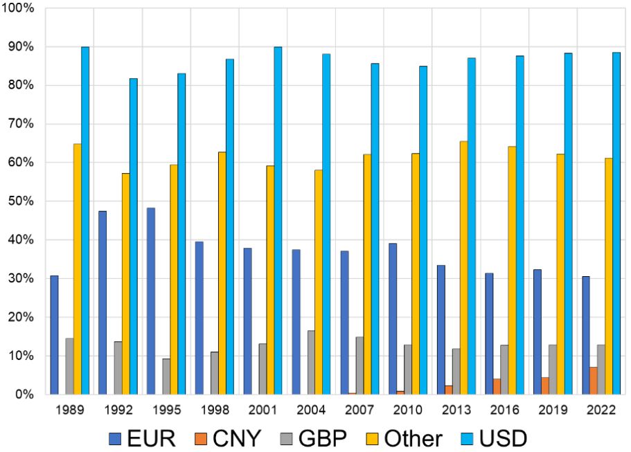 Z šetření, které provádí basilejská Banka pro mezinárodní platby každé tři roky, plyne, že podíl dolaru na mezinárodních devizových obchodech se stále pohybuje kolem 90 % (viz graf níže). Je tudíž výše než třeba po celá 90. léta, která navíc pro USA z valné většiny představovala makroekonomicky daleko úspěšnější dekádu, než byly ty následující. Podíl čínské měny na globálních devizových obchodech sice roste, ale je stále titěrný, ani ne desetinový. Své postavení ve světě ovšem ztrácí euro. V polovině 90. letech měny zemí dnešní eurozóny měly podíl na globálních devizových transakcích takřka 50%. Nyní už je to jen 30 %.